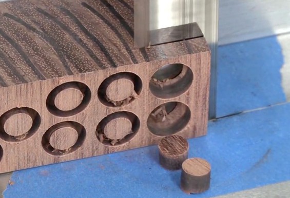A plug cutter is used to make a timber plug to hide a drilled hole.