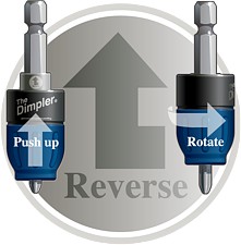 ![]() A clutch over-ride feature to easily reverse and remove screws from any angle! Reverse feature Set your drill in REVERSE (refer to the drill’s instruction manual) Grip the Dimpler head firmly and push inwards while rotating the head clockwise. A click/lock feel will indicate that it is engaged. The driving bit will now be exposed to engage the screw head. Resetting the Dimpler back into driving mode, simply push the head inwards again while rotating it counter clockwise. The head part will pop back out. |