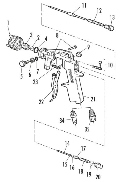 - Always disconnect air and material lines before servicing the gun.