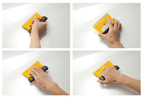 How to get a grip. There are several ways to grip. Big hole in the handle and curved forms on sides are for choosing a perfect grip as usage. Blade cover moves back and forth for a better position, and users have a choice to detach it.