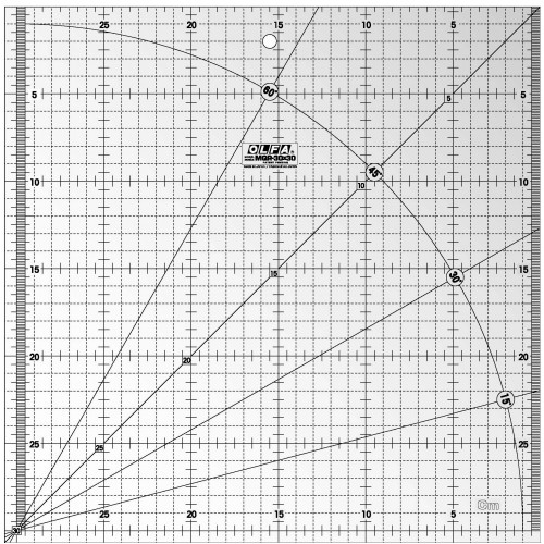 30cm x 30cm ruler, metric grid model. Non-slip for stable and safe cutting and frosted with black grid lines for clarity on light- and dark colour fabrics.