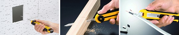 Snap-off blade cutter is placed in the deep part of the body to avoid unexpected touching while using the saw on the other side.Saw makes a hole in a dry wall and cut wood, while cutter exposes hard wiring and cut cardboard.