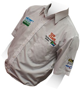 The shirt represents the Vermont Sales company. The leading brands are embroidered on the sleeves and the chest.